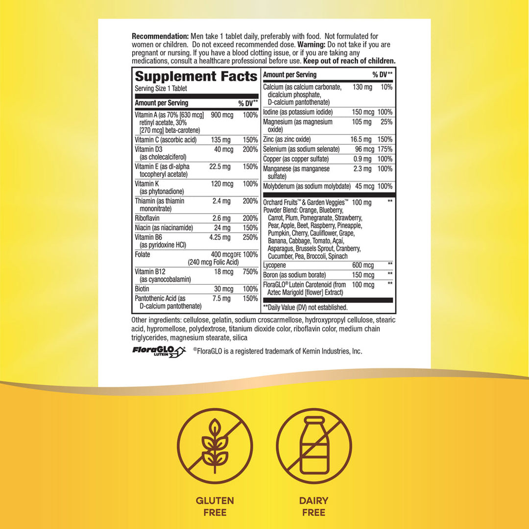 With just one tablet a day, Alive Men’s Multivitamin (50 count) delivers a comprehensive blend of vitamins, minerals, and food-based nutrients. It bridges the nutritional gap with the power of the Orchard Fruits™ & Garden Veggies™ powder blend, offering superior health support compared to basic synthetic vitamins.