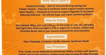 A natural mix of oats, roasted peanuts, and cinnamon. High in plant-based protein and fiber, free from added sugar, and perfect for a quick, healthy breakfast.